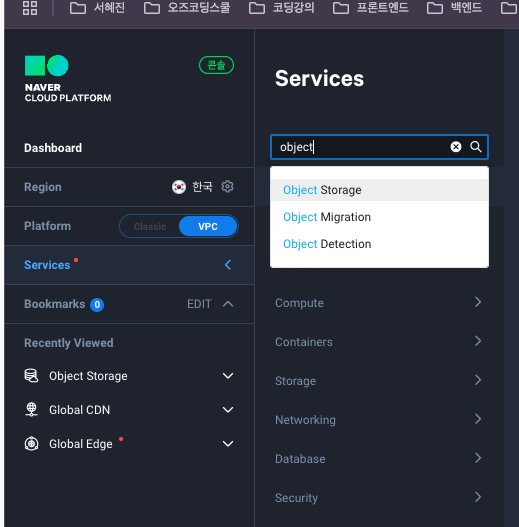 콘솔을 누르고 object storage를 검색해서 들어갑니다.