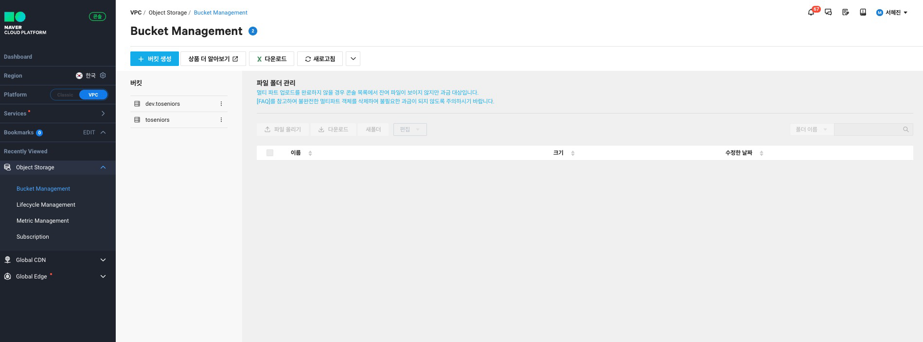 object storage의 Bucket Management로 들어가서 버킷을 생성합니다